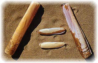 COUTEAUX Ces coquillages vivent enfuis verticalement dans le sable à faible profondeur. Ils peuvent s'enfoncer, grâce à leur pied très agile, de plusieurs dizaines de centimètres en une fraction de seconde. Cuits, ils sont très coriaces, ce qui limite leur utilisation culinaire. Par contre, ils servent fréquement d'appâts pour la pêche. Pharus legumen a longtemps été placé dans la même famille que les couteaux vient récemment de déménager chez les Solecurtes (ci-dessous). |